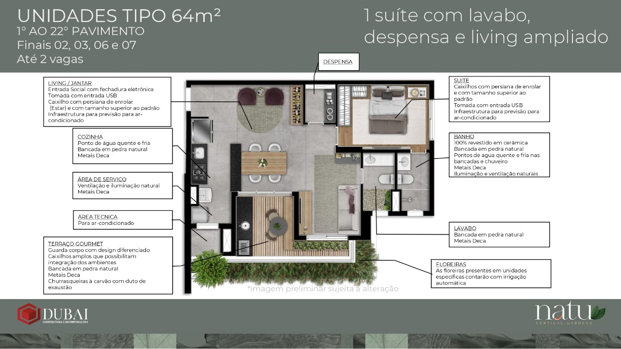 As unidades do Natu Vertical Gardens foram projetadas para otimizar ambientes e garantir melhor aproveitamento de espaço, com layouts que valorizam a circulação, iluminação natural e integração entre os cômodos.